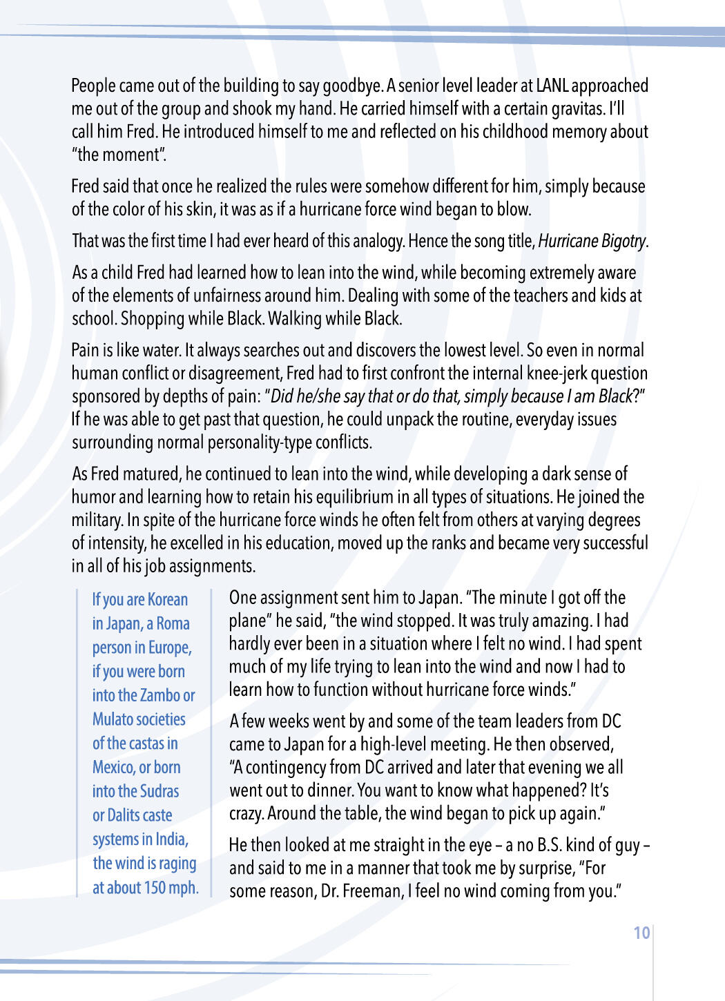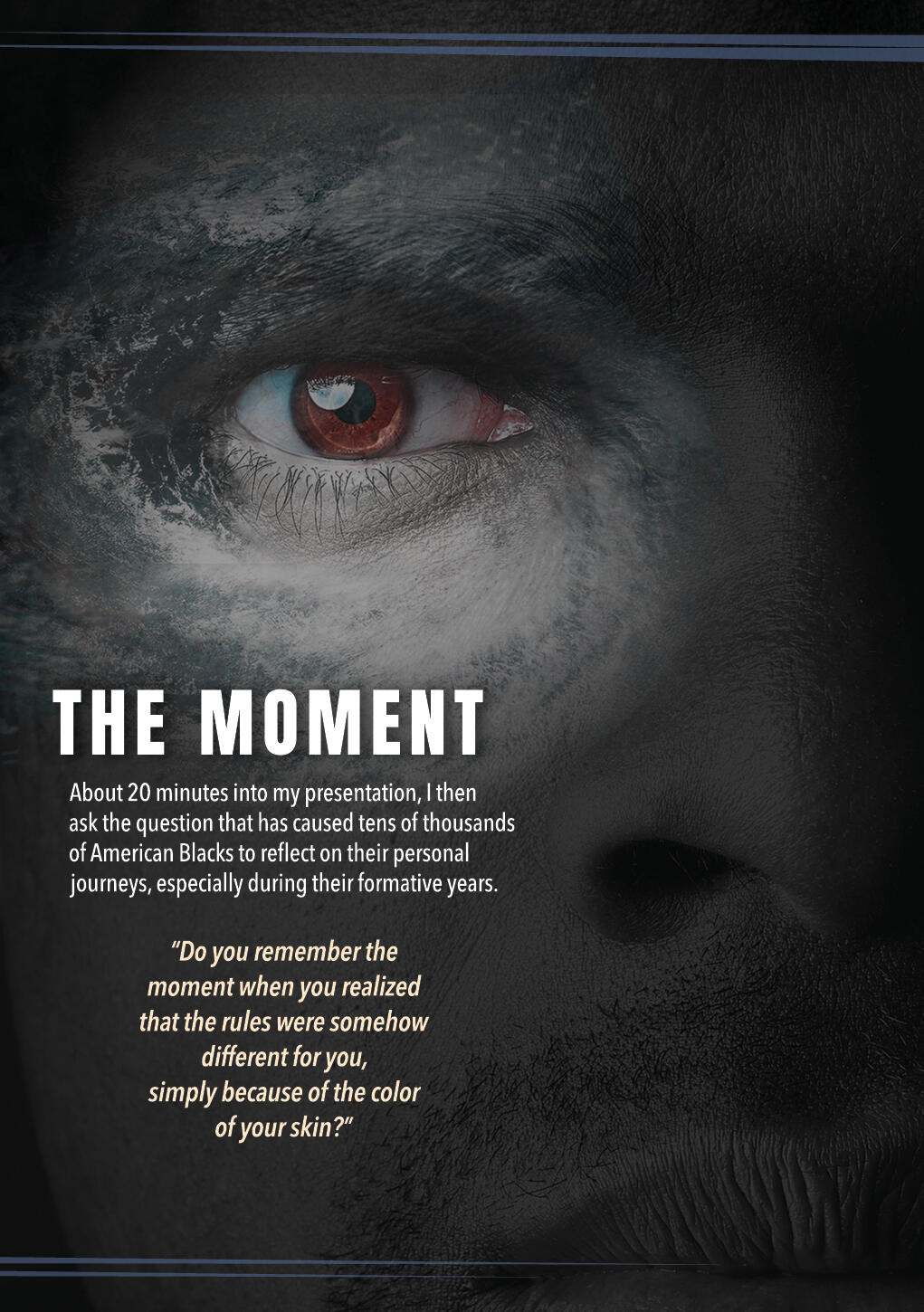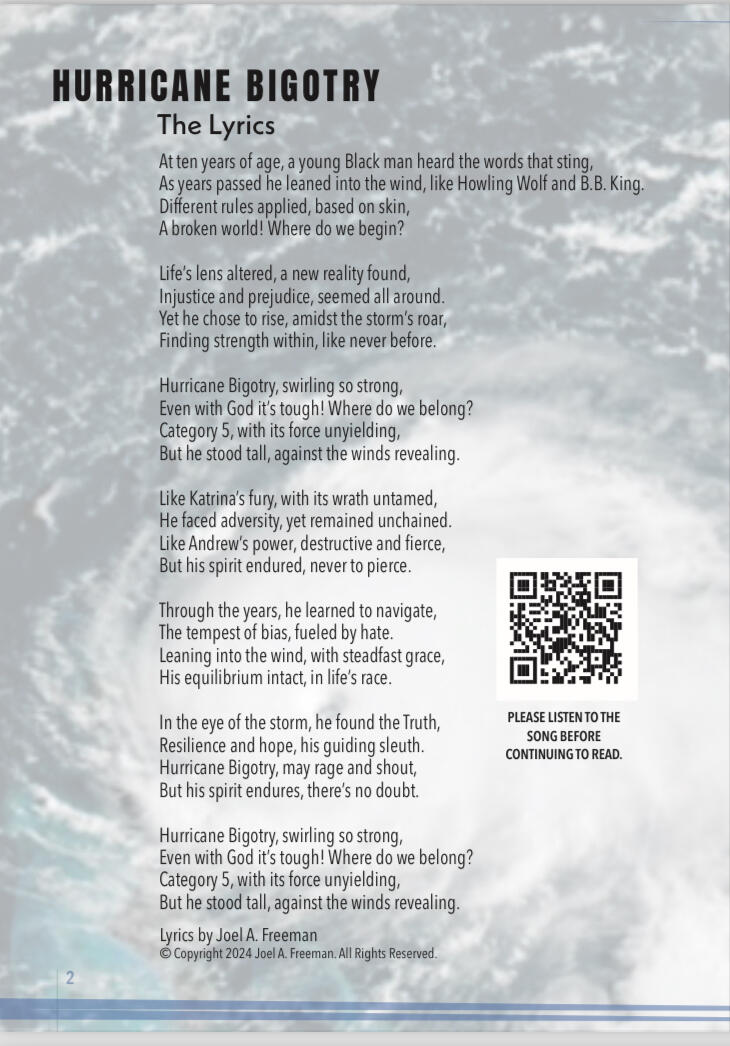 • High Risk = High RewardWe need to understand the risk/reward ratio. The higher the personal risk of vulnerability, curiosity and openness, the greater the relational payoff. It's the wisdom that emerges from the curiosity-driven life.CONVERSATION STARTER: Allow this song and story to do some of the heavy lifting for you in launching important conversations with others around you.Consider giving this behind-the-music story, with the song link, to a few friends or coworkers of African descent. Ask them to listen to the song, and then get together to hear their real-world experiences. Quantity copies available.Remind yourself of the times throughout your life that you have felt like someone truly listened to you without judgment. As your friend is sharing his/her reflections on Hurricane Bigotry keep the spotlight on the other person by asking open-ended questions that help you gain more understanding.One may believe in pulling one's self up by the bootstraps...but most of us as Caucasians have never really spent the time to listen.When uncomfortable topics like reparations, statues, scientific racism, and walking while Black are raised, our default is to say something like, "My ancestors came from their own hardship in ________, and were never involved in slavery, so..." While it may be factual, eyes glaze over and it becomes apparent that this is not a good topic to discuss with you – minimizing the potential for meaningful conversations in the future.This is not a slam on those of us who are White or anyone else. We all are who we are, with opportunities for personal growth at every turn. And it is important for all of us to be comfortable in our own God-given skin, which includes every tone. And some how, in some way get along with each other.It's all about mutual respect, asking open-ended questions, listening, and truly hearing.It's also an invitation for all of us to seek to understand before seeking to be understood.