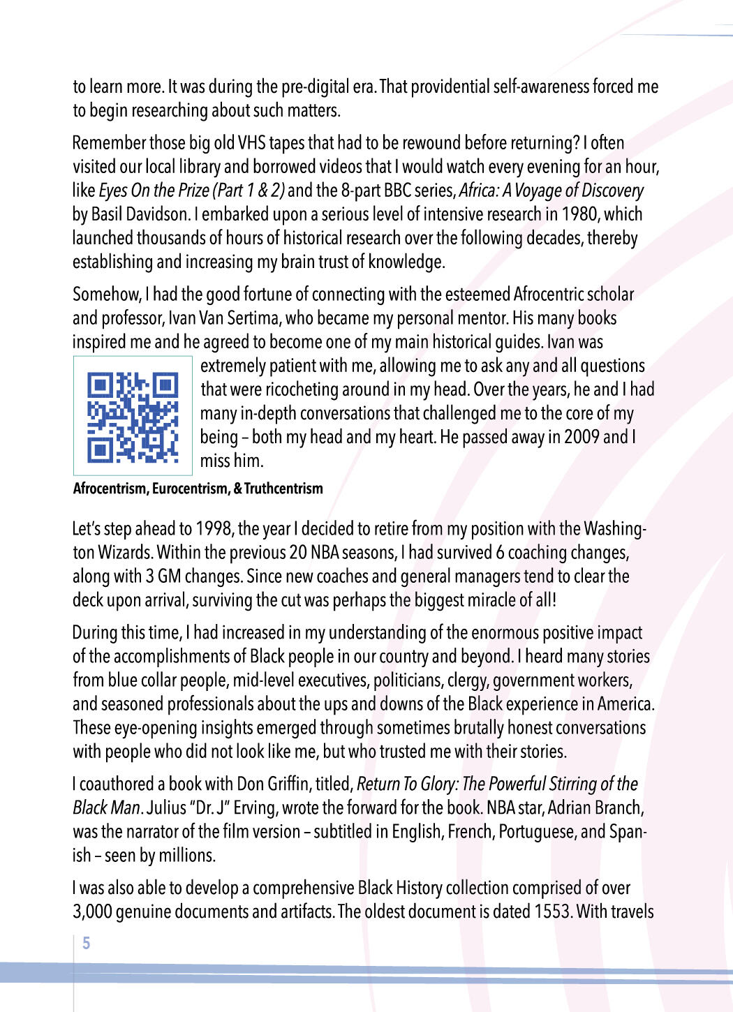 E. My interest in Black History was launched in earnest well over 4 decades ago in 1980 when some Black pro athletes asked me questions about the role ancient Africans played in biblical and extra-biblical history.I didn’t have a clue. I began researching the topic so that I could at least respond somewhat intelligently to the plethora of topics that came up.As we have already learned, I was one of the first chaplains in the history of the NBA, starting in 1978 with the Washington Bullets and retiring 20 seasons later in 1998.I had heard of Ivan Van Sertima and had seen some old, grainy VHS videos of Ivan either in a debate or lecturing. I knew that he was a professor of Africana Studies at Rutgers University and was revered as a man of great intellect and integrity.In the early 1990s I somehow got ahold of his home phone number and I called him. This was during the pre-digital era. His wife, Jaqueline, answered. I asked to speak to Ivan. Even though she put her hand over the receiver, I could hear her whispering to him about some gentleman wanting to talk with him.When he came on the phone, I said, “Hello, Ivan, I have heard a lot about you and I would like to get to know you. I have much to learn from you. And I would hope that you would like to get to know me also.”We talked for at least 45 minutes in that first encounter. A great conversation. He made me feel at ease and extremely comfortable. Near the end of the conversation, he asked for my home address. I didn’t think anything of it and gave it to him.Approximately 3 weeks later a big box filled with at least 15 volumes of his books arrived unexpectedly in the mail. I was blown away. There were topics about Black presence in Asia, the Olmec civilization, they came before Columbus, the Moors, and so much more.The one book that immediately grabbed my attention was Egypt Revisited. Reading that book and seeing the images was kind of like wrapping my brain around a telephone pole at 130 mph. A life changing experience. So much so that, after a few chapters, I called Ivan.After thanking him profusely for such a kind gift of knowledge in literature, I asked him if he would consider becoming my primary historical guide and mentor. To my great surprise, he consented.Wow!! The many conversations we had as the months and years passed!! I only wish I could explain the essence of hours upon hours of discussing wide-ranging topics germane to ancient African history. He was extremely patient with me, allowing me to ask any and all questions ricocheting about in my little pea brain.In the video taped presentations I had seen, Ivan was powerful and authoritative, holding the audience in the palm of his hand. In our phone conversations he was almost shy. I had to “prime the pump” with questions and then he would go into great, elegant detail with me. I’d listen and take notes.Our friendship deepened. For instance, it was a great honor and privilege when Ivan opened up with me about some of the struggles and disrespect he was experiencing in the world of academia. I will not go into detail, but he was very sad at times by the way some powerful leaders actively sought to marginalize him. Even though we never met in person (which I regret), we became very good friends. He gave me a front row seat to the struggles in his journey.Every Christmas season I would receive a signed card from him and Jacqueline.One memorable conversation was when I asked him about his view of the Jesus of the Bible. Many Afrocentric scholars point to a number of legitimate, historically documented problems they have with how Christianity was used by pro-slavery leaders in the South to try to justify enslavement and the Slave Trade itself.Frankly, I wasn’t sure how Ivan would respond. There was a moment of silence and then he said quietly and with great emotion, “Oh yes, I love Jesus Christ with all my heart.”That meant more to me than anything else he could’ve said at that moment. He then went on to eloquently describe the impact & influence of Augustine, Cyprian, Tertullian and other 2nd to 4th century Christian scholars — especially in North Africa — long before the travels of European explorers into central Africa starting in the mid-1800s.Ivan passed away in 2009. The years have clicked by and I still miss him greatly — our conversations and our friendship…
