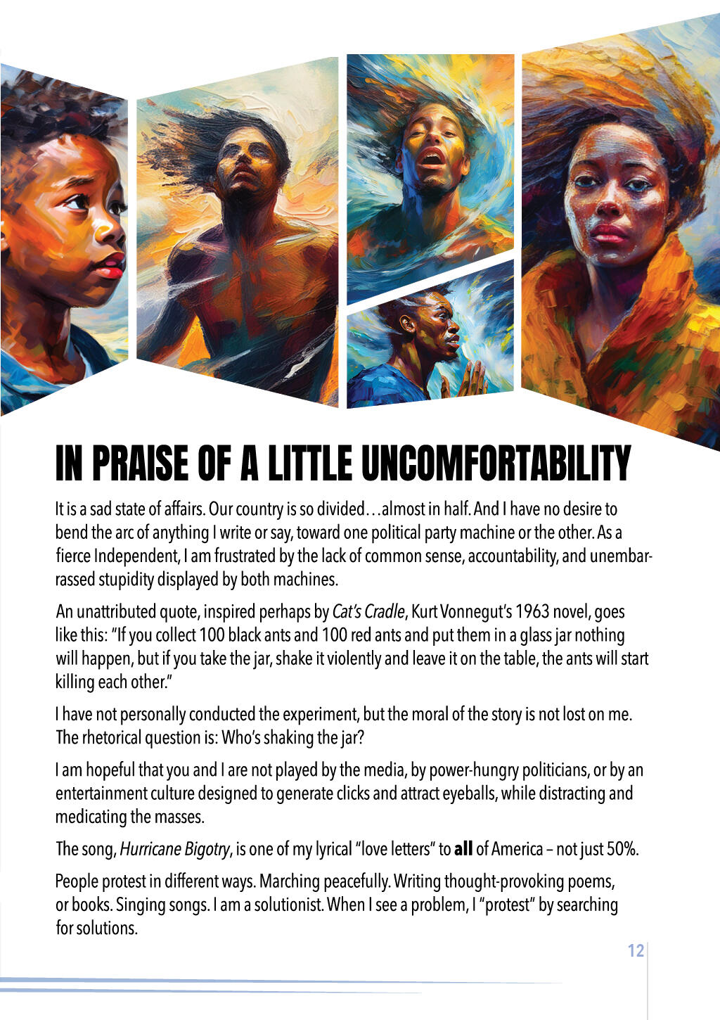 A. It is a sad state of affairs. Our country is so divided…almost in half. And I have no desire to bend the arc of anything I write or say, toward one political party machine or the other. As a fierce Independent, I am frustrated by the lack of common sense, accountability, and unembarrassed ineptness displayed by both party machines.An unattributed quote, inspired perhaps by Cat's Cradle, Kurt Vonnegut's 1963 novel, goes like this: "If you collect 100 black ants and 100 red ants and put them in a glass jar nothing will happen, but if you take the jar, shake it violently and leave it on the table, the ants will start killing each other."I have not personally conducted the experiment, but the moral of the story is not lost on me. The rhetorical question is: Who's shaking the jar?I am hopeful that you and I are not played by the media, by power-hungry politicians, or by an entertainment culture designed to generate clicks and attract eyeballs, while distracting and medicating the masses.The song, Hurricane Bigotry, is one of my lyrical love letters to all of America – not just 50%.EMBRACING DIFFERENT TYPES OF PEACEFUL PROTESTPeople protest in different ways. Marching peacefully. Writing thought-provoking poems, or books. Singing songs. I am a solutionist. When I see a problem, I "protest" by identifying societal problems, searching for some options, and then helping to create solutions.Once your “WHY” is discovered,