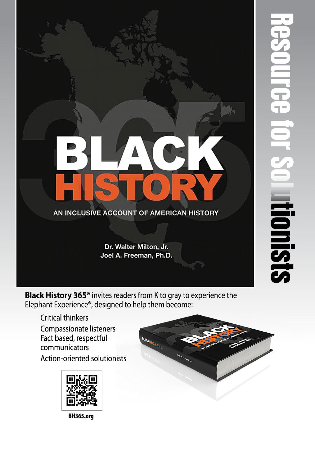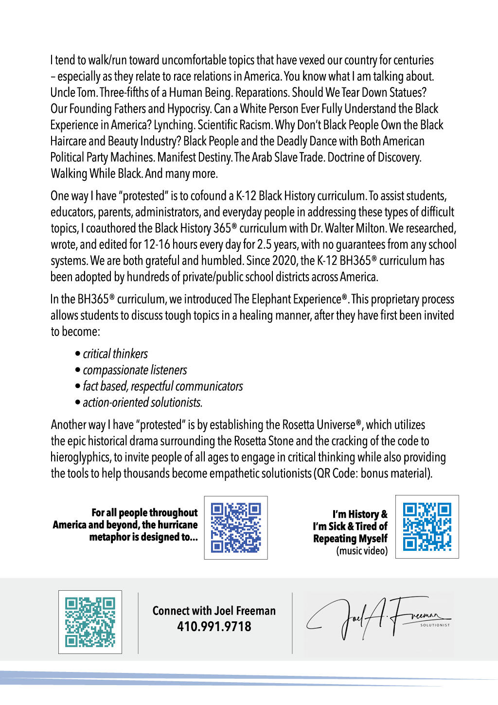 • And many more…BLACK HISTORY 365®One way I have "protested" is by cofounding a K-12 Black History curriculum publishing company (see inside back cover). To assist students, educators, parents, administrators, and everyday people in addressing these types of difficult topics, I coauthored the Black History 365® curriculum with Dr. Walter Milton. We researched, wrote, and edited for 12-16 hours every day for 2.5 years, with no guarantees from any school systems. We are both grateful and humbled. Since 2020, the K-12 BH365® curriculum has been adopted by well over 400 private/public school districts across America.In the BH365® curriculum, we introduced The Elephant Experience®. This proprietary process allows students to discuss tough topics in a healing manner, after they have first been invited to become:• critical thinkers